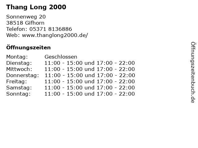 | Öffnungszeiten Thang Long 2000 in Gifhorn anzeigen | |