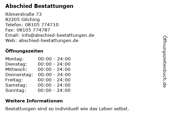 | Öffnungszeiten Abschied Bestattungen in Gilching anzeigen | |