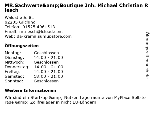 Branchen & Suchbegriffe zu MR.Sachwerte&Boutique Inh. Michael Christian Riesch:christian, einzelhandel, michael, mr.sachwerte&boutique, riesch, self-storage-anbieter |