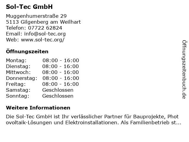 | Öffnungszeiten Sol-Tec GmbH in Gilgenberg am Weilhart anzeigen | |