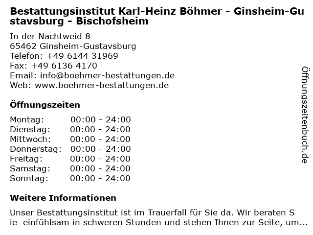 2 Bestattungsinstitut Hornauer | Mainz - Teil der mymoria Familie (Entfernung: 3,93 km) Wilhelm-Theodor-Römheld-Str. 14, 55130 Mainz 6 Arnold Stallmann Schreinerei Bestattungsinstitut (Entfernung: 6,18 km) Schifferweg 12, 55299 Nackenheim |