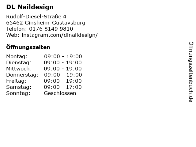 | Öffnungszeiten DL Naildesign in Ginsheim-Gustavsburg anzeigen | |