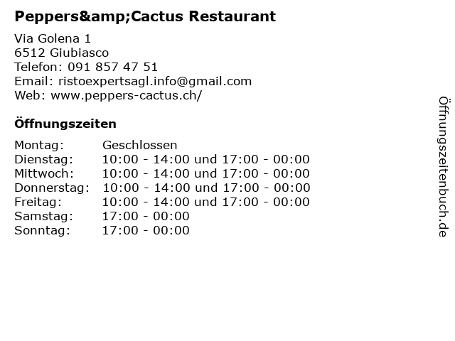 | Öffnungszeiten Peppers&Cactus Restaurant in Giubiasco anzeigen | |