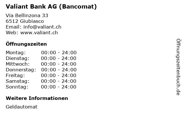 | Öffnungszeiten Valiant Bank AG (Bancomat) in Giubiasco anzeigen | |