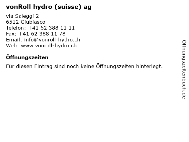 | Öffnungszeiten vonRoll hydro (suisse) ag in Giubiasco anzeigen | |