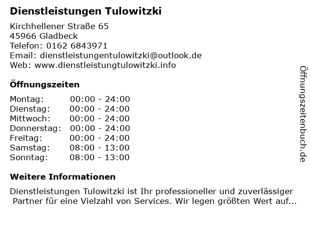 | Öffnungszeiten Dienstleistungen Tulowitzki in Gladbeck anzeigen | |