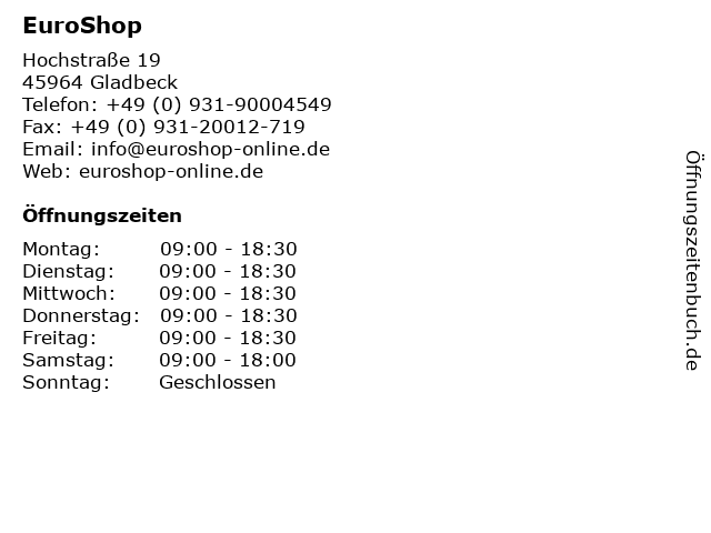 | Öffnungszeiten EuroShop in Gladbeck anzeigen | |