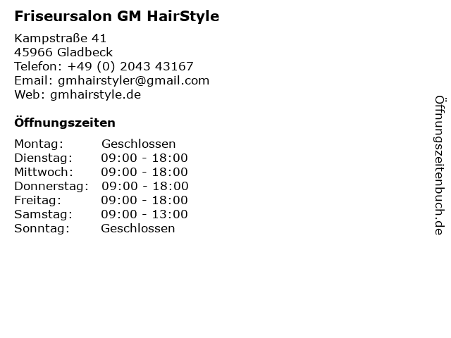 | Öffnungszeiten Friseursalon GM HairStyle in Gladbeck anzeigen | |