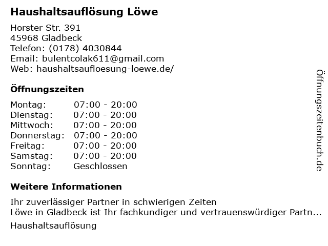 | Öffnungszeiten Haushaltsauflösung Löwe in Gladbeck anzeigen | |