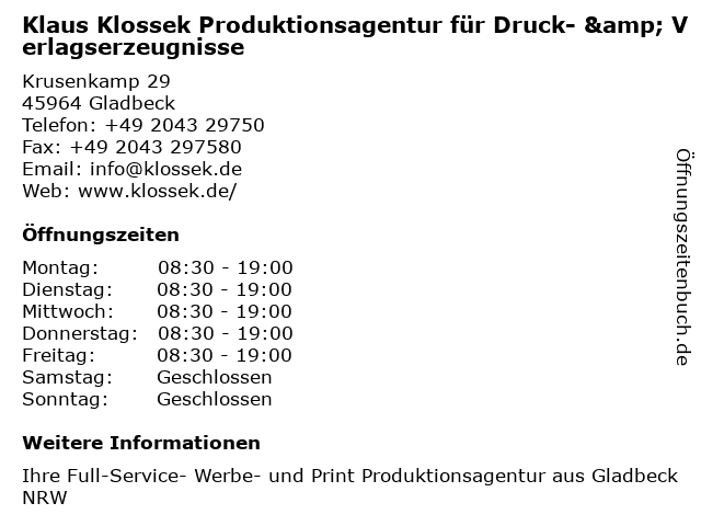 1 Produktionsagentur für Druck und Verlagserzeugnisse Klaus Klossek (Entfernung: 0,00 km) Krusenkamp 29, 45964 Gladbeck 6 Spanek printstudio Fotokopien und Druck bürobedarf, -maschinen und zubehör (Entfernung: 12,99 km) Segerothstr. 79, 45141 Essen-Nordviertel |