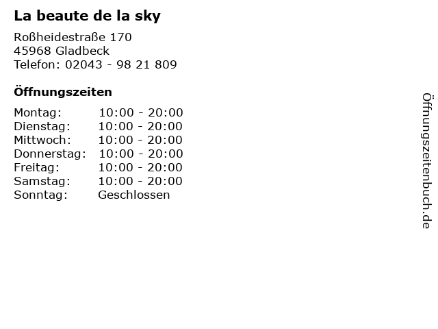 | Öffnungszeiten La beaute de la sky in Gladbeck anzeigen | |