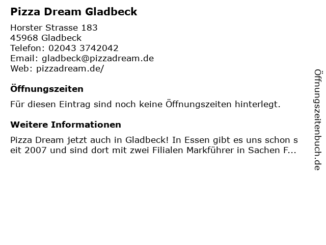| Telefonnummer Pizza Dream Gladbeck in Gladbeck (02043 3742042) anrufen | |
