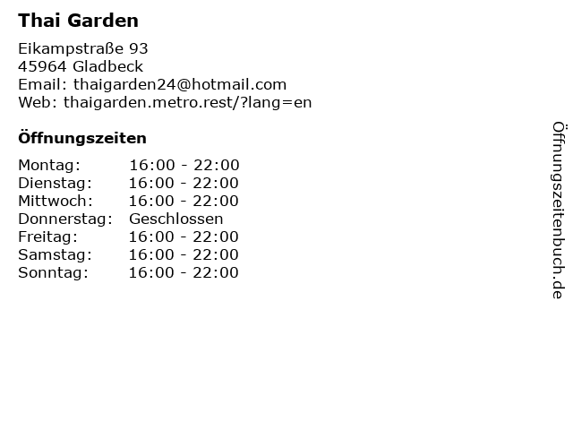 | Öffnungszeiten Thai Garden in Gladbeck anzeigen | |