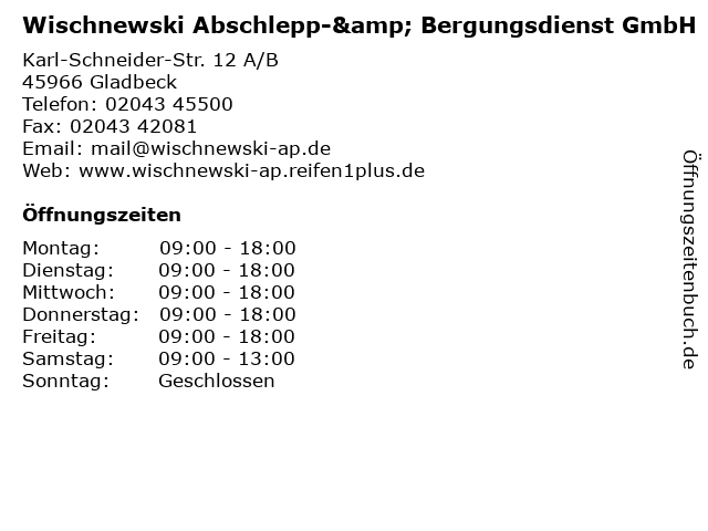 1 Wischnewski Abschlepp; & Bergedienst GmbH Abschleppdienst (Entfernung: 0,15 km) Karl-Schneider-Str. 12b, 45966 Gladbeck 2 Ermes GmbH, Hubert Abschlepp- und Bergungsdienst (Entfernung: 12,03 km) Stoppenberger Str. 104, 45141 Essen 3 Abschlepp-Service u. Autoverwertung Lorenz (Entfernung: 17,21 km) Hubertusstr. 61, 45657 Recklinghausen 6 |