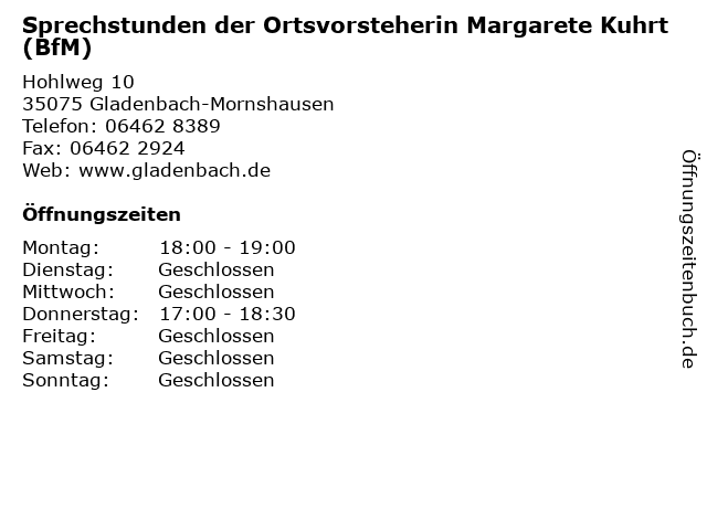 3 Sprechstunden der Ortsvorsteherin Christiane Becker (Entfernung: 2,08 km) Im Seckbach 10, 35075 Gladenbach-Erdhausen 4 Sprechstunden des Ortsvorsteher Wilhelm Keck (SPD) (Entfernung: 4,48 km) Freiherr-v.-Stein-Str. 47, 35075 Gladenbach-Weidenhausen 5 Sprechstunden der Ortsvorsteherin Melanie Krämer-Kowallik (Entfernung: 4,89 km) In der Heeb 6, 35075 Gladenbach-Römershausen 6 |