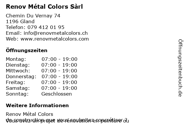| Öffnungszeiten Renov Métal Colors Sàrl in Gland anzeigen | |