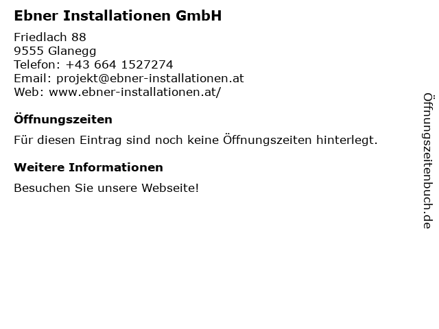 | Öffnungszeiten Ebner Installationen GmbH in Glanegg anzeigen | |