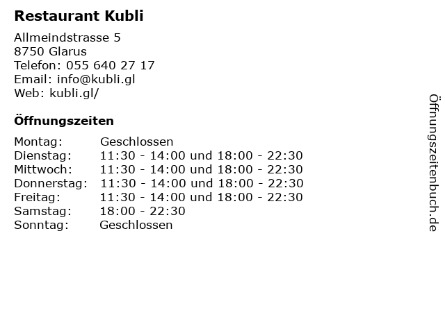 | Öffnungszeiten Restaurant Kubli in Glarus anzeigen | |
