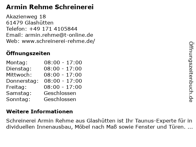 | Öffnungszeiten Armin Rehme Schreinerei in Glashütten anzeigen | |