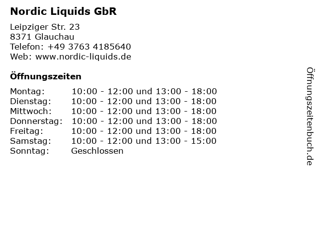 | Öffnungszeiten Nordic Liquids GbR in Glauchau anzeigen | |