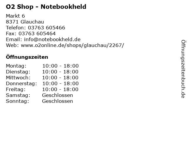 | Öffnungszeiten O2 Shop - Notebookheld in Glauchau anzeigen | |