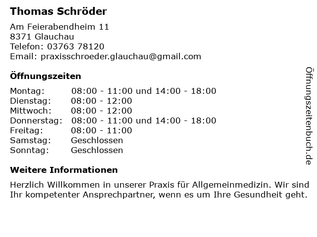 | Öffnungszeiten Thomas Schröder in Glauchau anzeigen | |