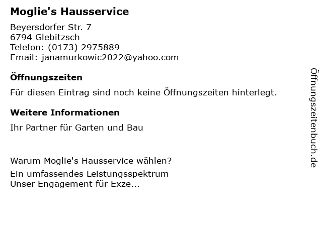 | Öffnungszeiten Moglie's Hausservice in Glebitzsch anzeigen | |