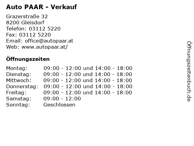 | Öffnungszeiten Auto PAAR - Verkauf in Gleisdorf anzeigen | |