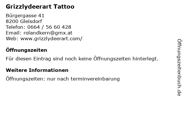 | Öffnungszeiten Grizzlydeerart Tattoo in Gleisdorf anzeigen | |