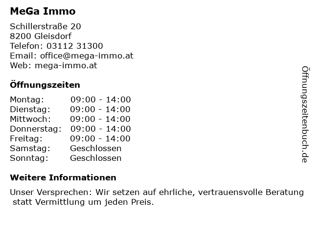 | Öffnungszeiten MeGa Immo in Gleisdorf anzeigen | |