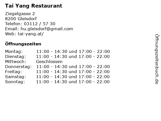 | Öffnungszeiten Tai Yang Restaurant in Gleisdorf anzeigen | |