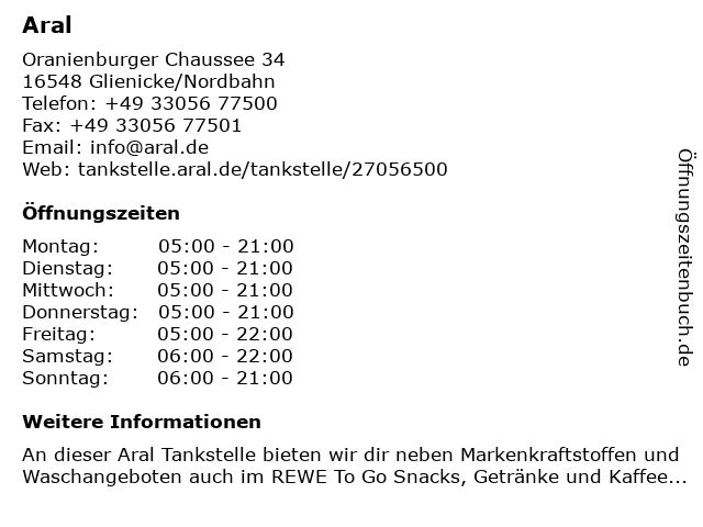 | Öffnungszeiten Aral in Glienicke/Nordbahn anzeigen | |