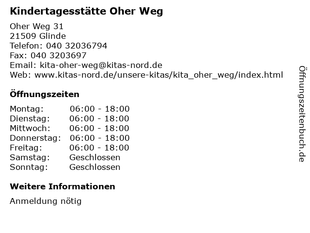 | Öffnungszeiten Kindertagesstätte Oher Weg in Glinde anzeigen | |