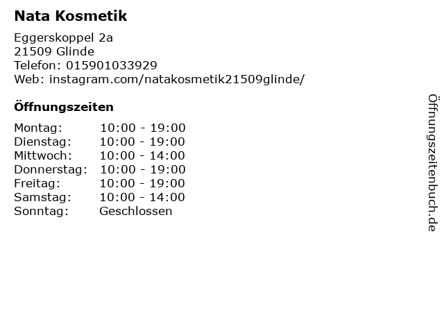 | Öffnungszeiten Nata Kosmetik in Glinde anzeigen | |