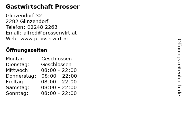 | Öffnungszeiten Gastwirtschaft Prosser in Glinzendorf anzeigen | |