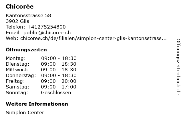 | Öffnungszeiten Chicorée in Glis anzeigen | |