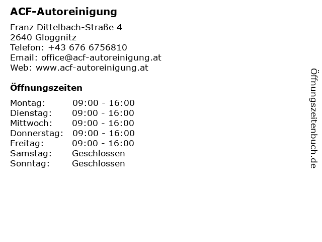 | Öffnungszeiten ACF-Autoreinigung in Gloggnitz anzeigen | |