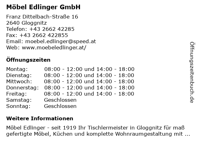 | Öffnungszeiten Möbel Edlinger GmbH in Gloggnitz anzeigen | |