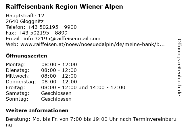 Branchen & Suchbegriffe zu Raiffeisenbank Region Wiener Alpen:alpen, bankstelle, beratung, devisen, digitale, finanzen, geld wechseln, geldautomat, gloggnitz, kompetenzzentrum, nö, raiffeisen, raiffeisenbank, region, sparen, süd, vermögen, vorsorge, wiener |