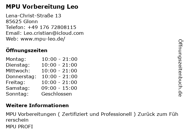 | Öffnungszeiten MPU Vorbereitung Leo in Glonn anzeigen | |