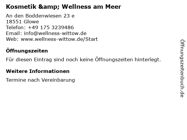 | Öffnungszeiten Kosmetik & Wellness am Meer in Glowe anzeigen | |
