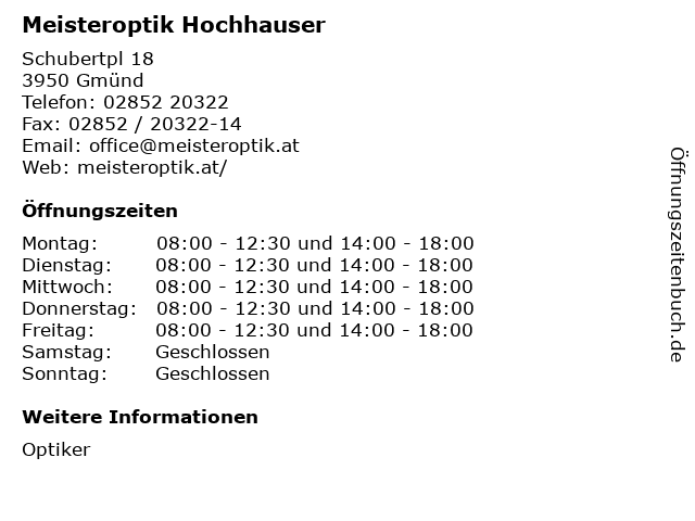 | Öffnungszeiten Meisteroptik Hochhauser in Gmünd anzeigen | |