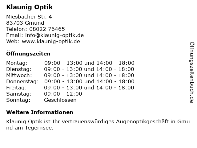 | Öffnungszeiten Klaunig Optik in Gmund anzeigen | |