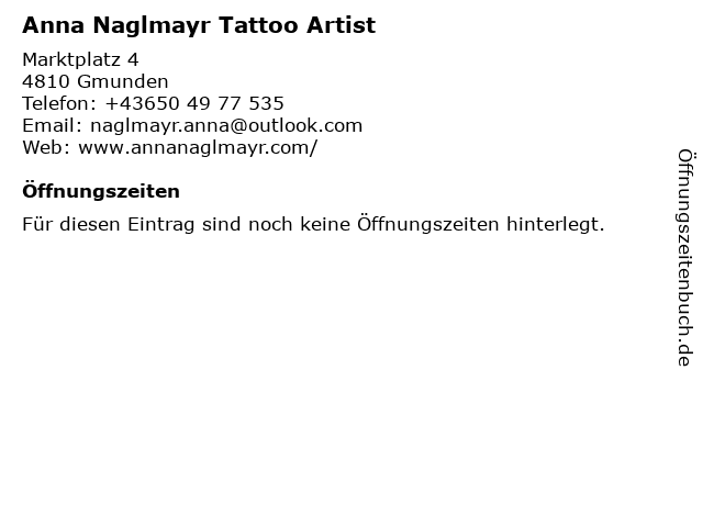 | Öffnungszeiten Anna Naglmayr Tattoo Artist in Gmunden anzeigen | |