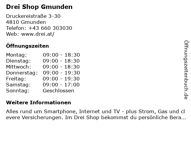 | Öffnungszeiten Drei Shop Gmunden in Gmunden anzeigen | |