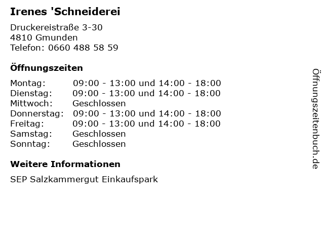 | Öffnungszeiten Irenes 'Schneiderei in Gmunden anzeigen | |