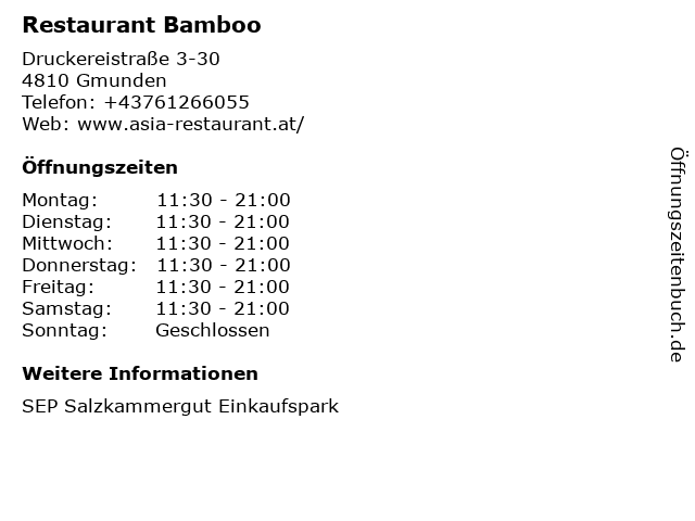 | Öffnungszeiten Restaurant Bamboo in Gmunden anzeigen | |