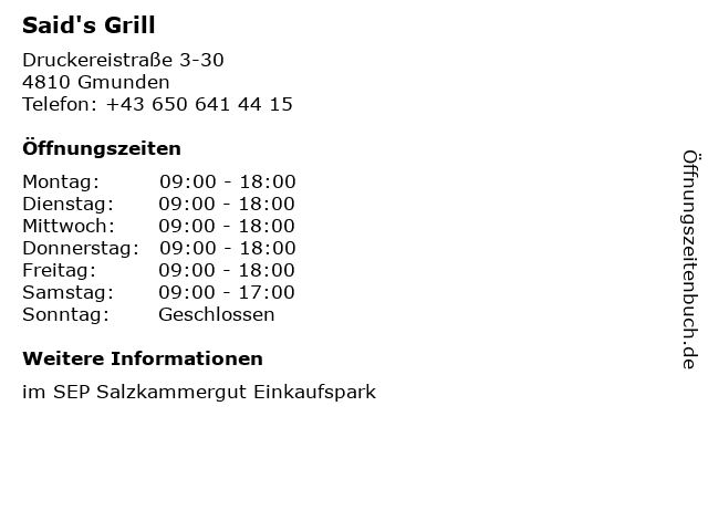 | Öffnungszeiten Said's Grill in Gmunden anzeigen | |