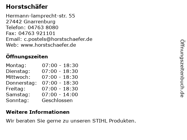 | Öffnungszeiten Horstschäfer in Gnarrenburg anzeigen | |