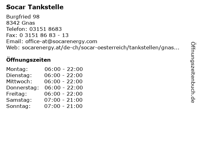 | Öffnungszeiten Socar Tankstelle in Gnas anzeigen | |